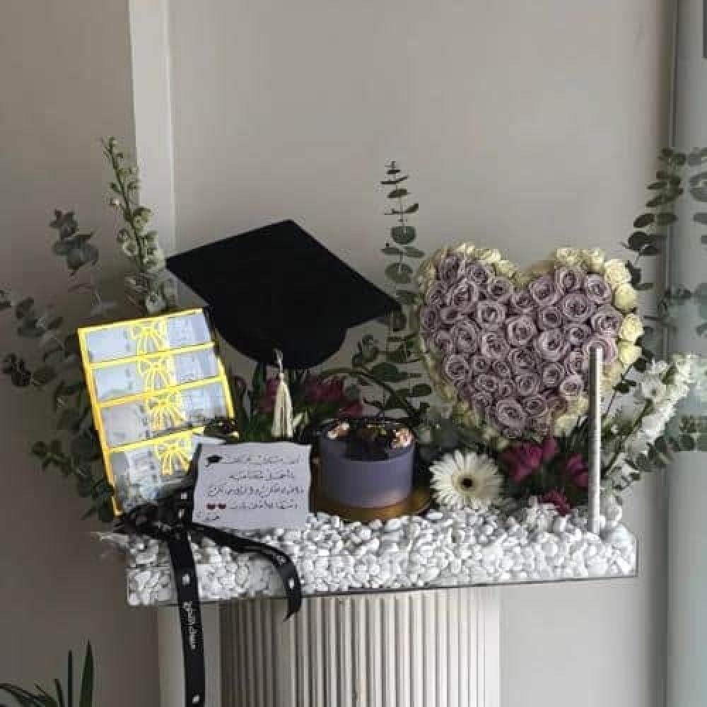 احتفل بلحظة التخرج بأجمل تنسيق فاخر يجمع بين زهور القلب البنفسجية، قبعة التخرج الرمزية، ، وصندوق شوكولاتة راقي. هدية تعبر عن الفخر والامتنان بمنتهى الأناقة.