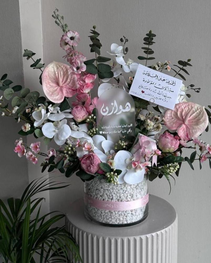 تشكيلة فاخرة من الزهور البيضاء والوردية تنسدل بأناقة داخل فازة شفافة، محاطة برقي الأوركيد ولمسة ناعمة من الرقي. مثالية للإهداء المميز ولحظات الشكر أو الترحيب بروح ناعمة.