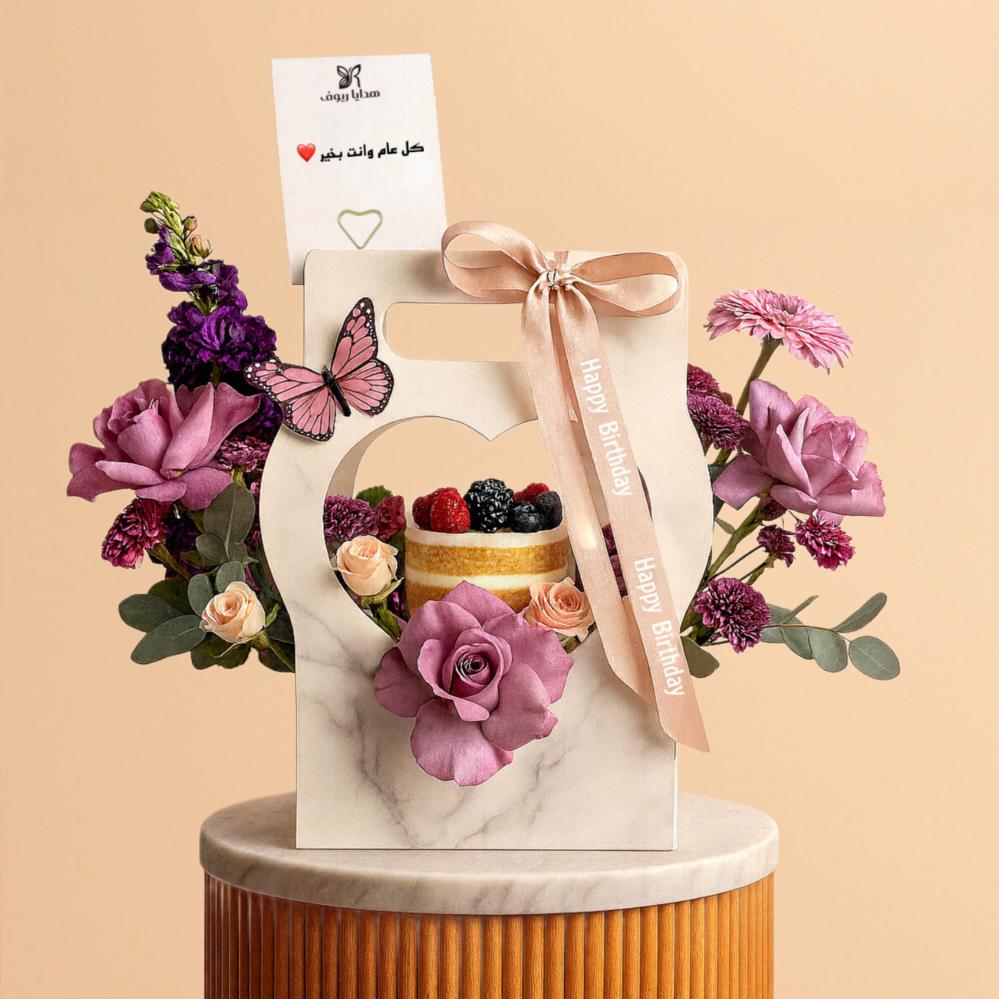 بوكس ورد فاخر بترتيب أنيق مع قالب كيك توت من جاناش داخل علبة على شكل قلب. هدية مثالية للمناسبات الرومانسية والاحتفالات الخاصة .