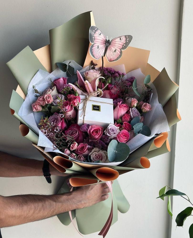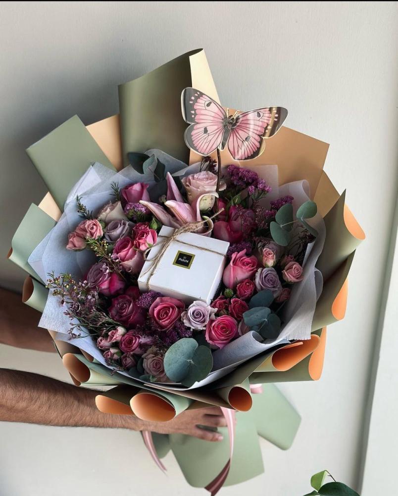 بوكيه ورد أنيق بتغليف فاخر يحمل بين طياته مشاعر حب صادقة، مُزين بصندوق شوكولاتة باتشي الراقية وفراشة ناعمة تعبّر عن حضورك المختلف. هدية تليق بمن تحب.