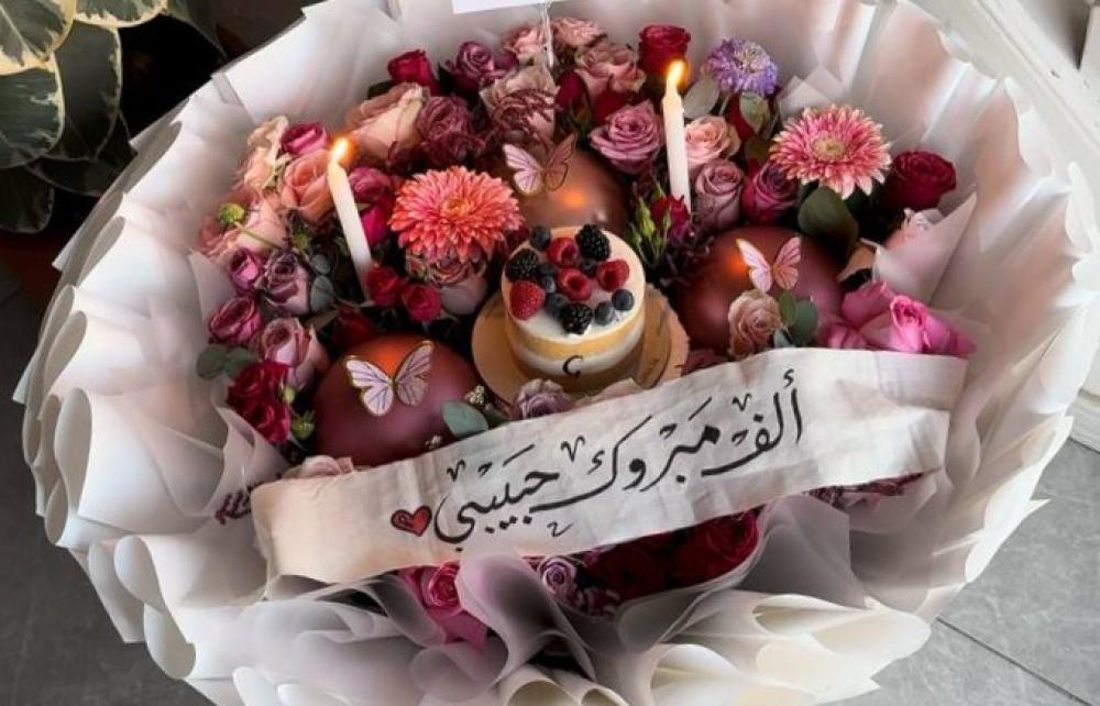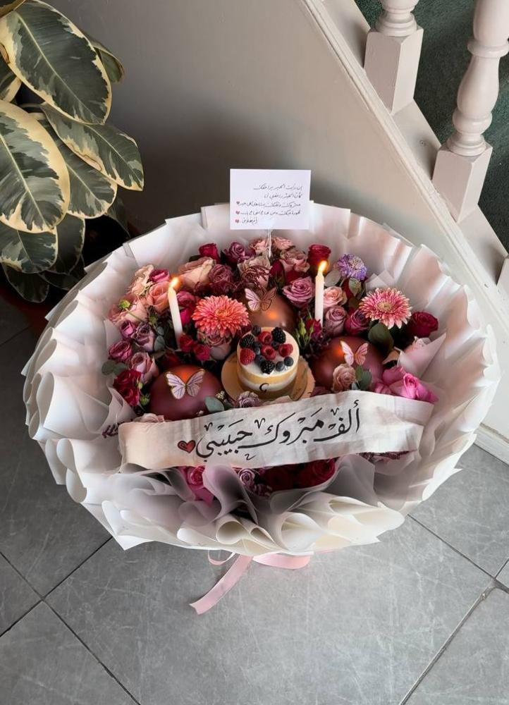 تنسيق ورود فاخر مع كيك تهنئة وبالونات، لمسة حب أنيقة لمناسبات التخرج، تهنئة، والمفاجآت الخاصة. اطلب الآن في جده