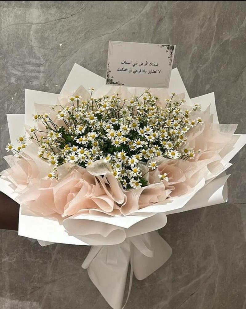 تنسيق ناعم من ورد بابونج صغير ابيض داخل تغليف وردي فاتح وابيض بلمسة انثوية