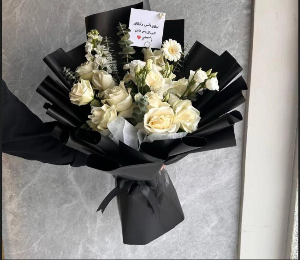باقة ورد أبيض فاخرة بتغليف أسود أنيق، مثالية للمناسبات الخاصة وهدايا التقدير والحب.
